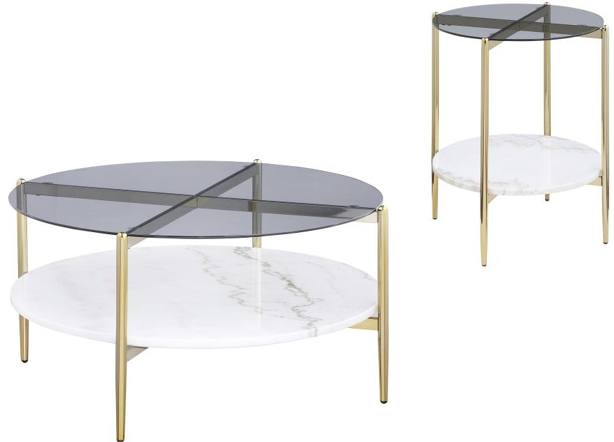 Modern coffee table set with smoked tempered glass tops and white marble shelves