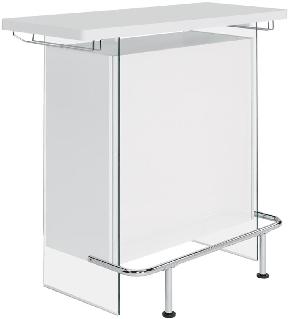 Elevate a multipurpose living room with this modern bar unit. A neutral finish, accented with polished chrome metal accents offers a striking design contrast. Supported and flanked by clear tempered glass side panels, this bar unit boasts ultra-modern elements as well for a dramatic feel.Read More