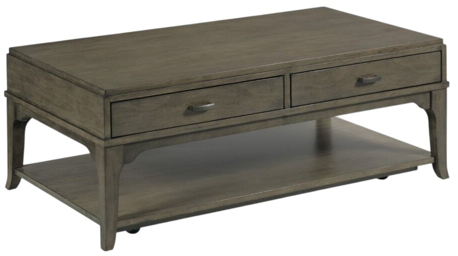 The England Furniture Nicolette charcoal rectangular cocktail table blends style and utility with its refined design. Crafted of charcoal solids and alder veneers, it features two spacious drawers and a lower shelf for added storage and display. Perfect for gathering spaces, this table offers both functionality and timeless appeal for your home.Read More