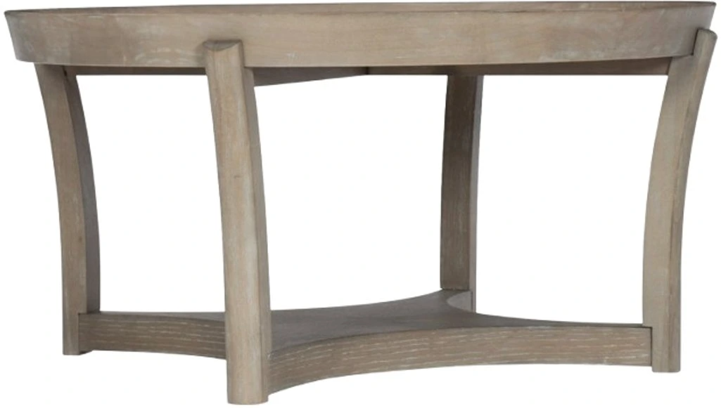 A rounded tabletop meets an angular base with soft curves, delivering style with swagger in the Affinity round cocktail table. The serene color palette of the wire-brushed greige finish on quartered oak veneers completes the soft modern look.Read More