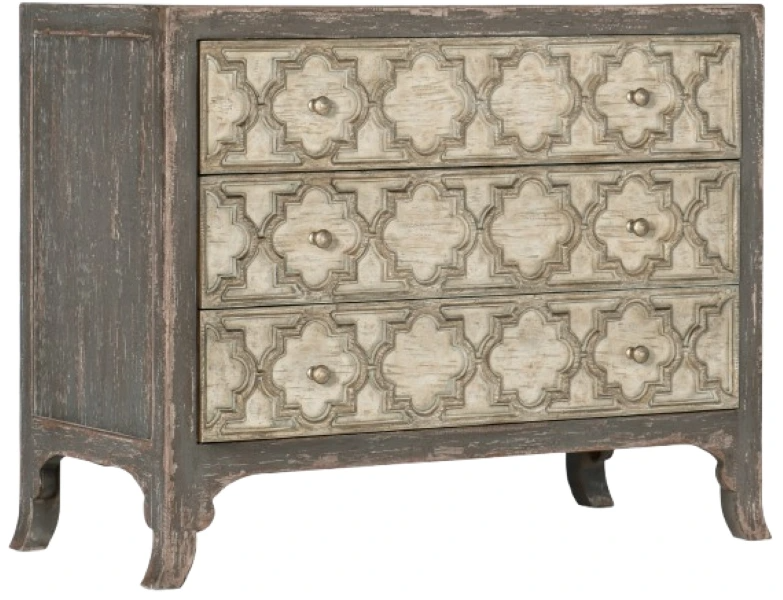 A touch of elegance is added with hand-hammered Florentine gold knob hardware. The three drawers have self-closing undermount drawer guides. In the top drawer is a drop-in felt liner and the bottom drawer is cedar lined. Three-plug electrical outlet. Delivering the casual look and feel of ageless pieces acquired during travels in the Old World, Hooker Furniture is featuring Alfresco, a whole-home collection with relaxed European provincial styling. The Alfresco collection has a well-traveled aesthetic that is inspired by heirloom pieces found in homes perched on cliffs along the Italian coastline of the Adriatic Sea. The collection of bedroom, dining room, occasional and accent furniture features moderately distressed designs that are enhanced by accent paint finishes that create an eclectic feel. Alfresco is constructed of oak, maple and hickory veneers and poplar solids, and includes several pieces with stone and metal accents.