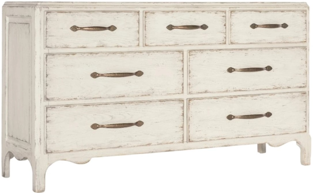 In a classic, charming design with a nostalgic flair, the American Dresser is crafted of oak veneers with a solid-wood edge top, a scalloped-shape base and finished in the time-worn white Daisy. There are 7 self-closing drawers, with the top left and right drawers with black removable felt liners.Read More