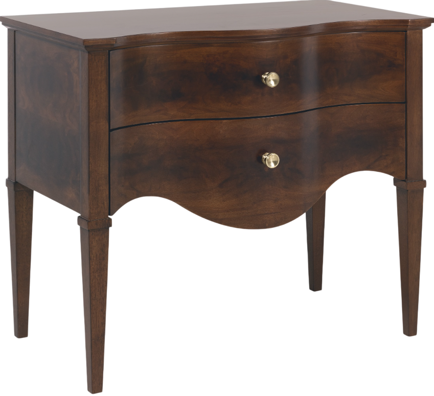 The Archives nightstand blends refined design with practicality. With its serpentine shape, walnut swirl veneers, and scalloped drawer fronts, this nightstand is a standout piece. It features two drawers with oak veneer bottoms and elegant satin brass hardware, offering both beauty and ample storage for your bedside essentials.Read More
