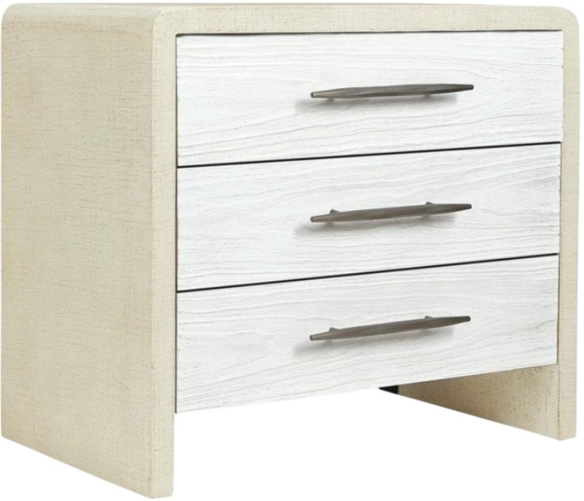 The sleek and modern Cascade 3-drawer nightstand combines the pebble beach lacquered burlap finish on the outside of the case with a cast resin soft white Chalk finish on the drawer fronts, accented by champagne-colored bar-pull hardware. Three self-closing drawers and a USB port and cord clip are featured.Read More