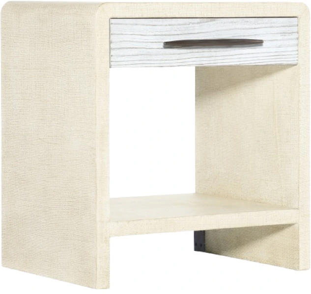 Relax and chill with the chic Cascade one-drawer nightstand in a serene color palette of whites, creams and taupe. The outside of the case is covered in a glazed burlap finish, while the self-closing drawer front is in a soft chalk color, accented by a champagne-colored bar pull.Read More