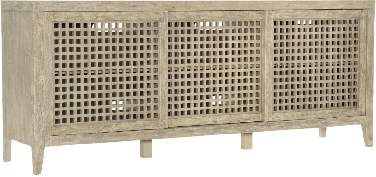 Crafted of poplar and hardwood solids with maple veneers, the console has 3 sliding doors with one adjustable shelf behind each door, a ventilated back panel, 3-plug outlet and accommodates up to an 80- inch tv. Inspired by the small farmhouses that dot the french and italian countryside and have been in the hands of the same family for generations, hooker furniture introduces the rustic ciao bella collection. The whole home collection is an eclectic mix of european farmhouse pieces that have the appearance of furniture that has been refinished multiple times as it has passed through the generations. Ciao bella includes bedroom, dining room, occasional, home office and accent furniture, and features a finish called timeworn gray that accentuates the historical nature of european farmhouses – many of which include a variety of furniture styles that have been added by each generation of owners.