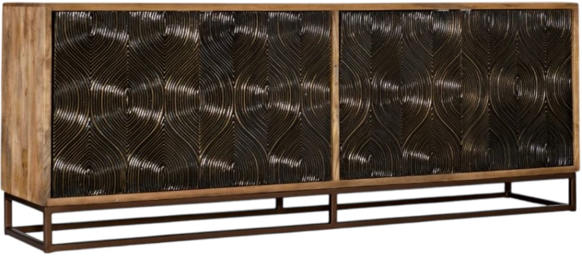 Captivating and intriguing, the swirl entertainment center contrasts a natural wood finish on the outside of the case and top with a dark swirl motif on the door fronts. Crafted of mango wood, brass foil with an iron base, there are 4 doors with push latches and a removable shelf behind each pair of doors.Read More