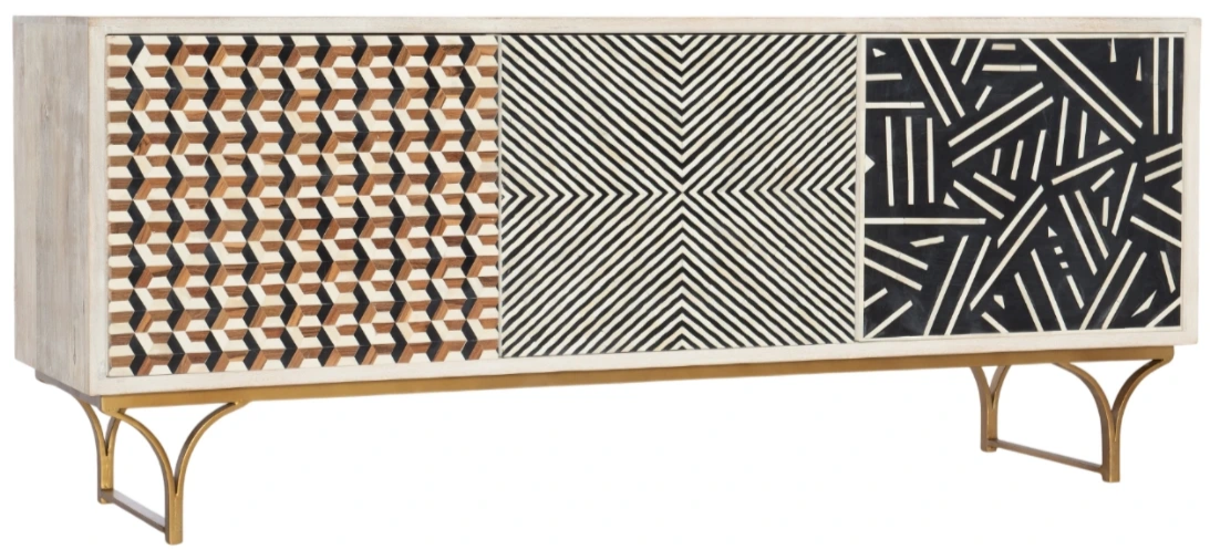 Distinguished by its three unique patterns on each door front, the Jaiden three-door credenza offers a modern tribal feel, created through a series of hand-placed, multi-tone bone inlays. Crafted of mango wood, it sits atop an iron base in a brass finish, creating an eye-catching statement piece for a variety of living spaces.Read More