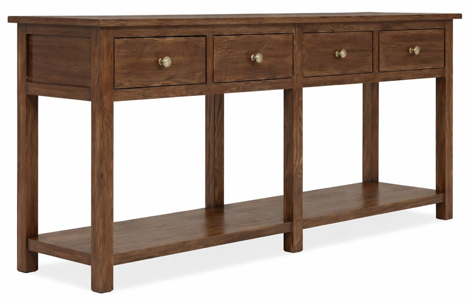 Showcasing the rich worn saddle finish, this sideboard is defined by deep, burnished tones reminiscent of hand-tooled leather and heirloom furniture. Featuring four wood-framed glass doors, adjustable shelves with plate grooves, and four self-closing drawers with a removable silverware tray, this piece combines practical storage with rustic sophistication.Read More