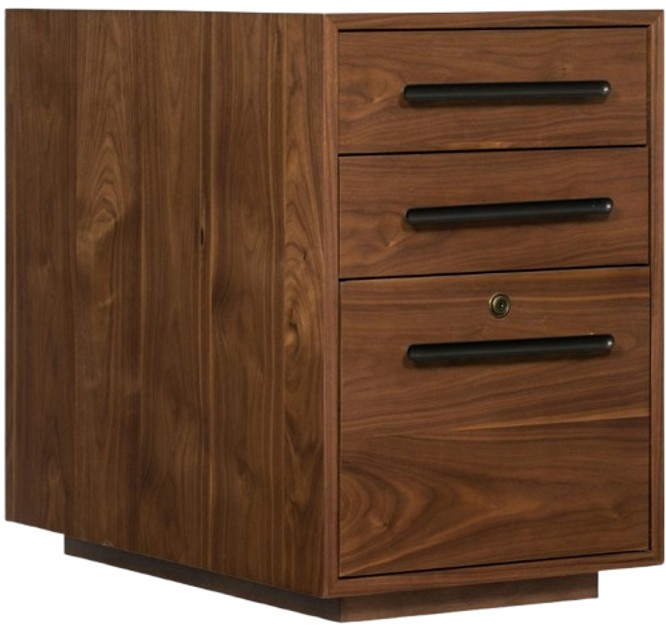 With a craftsman flair, this three-drawer Elon desk pedestal is crafted of flat cut walnut veneers in a medium wood finish with dark bronze metal bar pulls. The top drawer has two removable dividers, one writing insert and one removable pencil tray.Read More