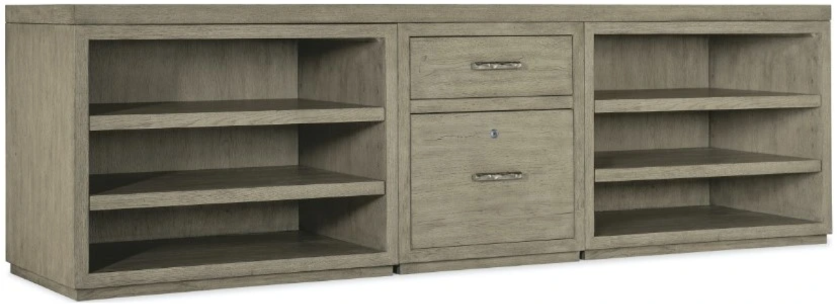 The expansive 96-inch wide top has a functional base including a small file in the center and an open desk cabinet on each end. The credenza has 2 drawers, with a top utility drawer and a lower locking file drawer with pendaflex filing system. The roomy desk cabinets each have 2 adjustable shelves. The credenza is fully finished on the back so it can be floated in a room. Capturing the essence of nature’s organic color palette and the aura of a rustic mountain cottage, Hooker Furniture introduces the Linville Falls collection. The whole home collection is designed for younger consumers looking for casual and contemporary furniture. Characterized by its rustic, weathered finish and clean lines paired with organic grain patterns, Linville Falls is constructed with split oak solids and veneers and has an overall organic aesthetic. It is featured in a soft Smoked Gray finish mixed with a Charred Black finish that is achieved through Shou Sugi Ban, a Japanese technique that creates an elegant burnt wood look. Its moderate scaling and fresh silhouettes offer a refreshing juxtaposition mixing old with new.