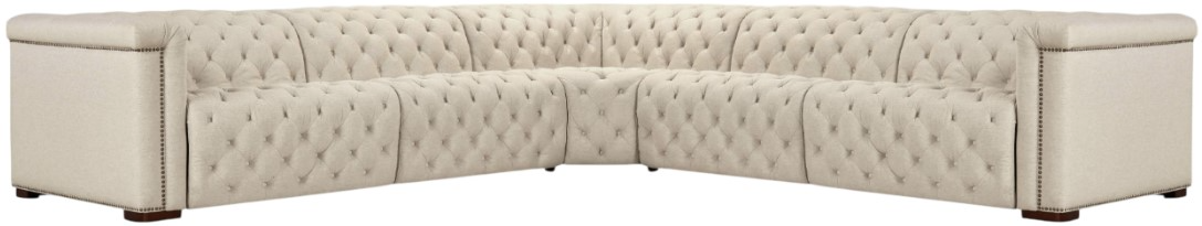 Upholstered in Aries beach performance fabric, the Savion Deux 5 Seat Sectional offers four power recliners and six power headrests, creating the ultimate seating experience. The fabric’s smooth texture is paired with dark wood accents, chesterfield tufting, and copper-toned nail trim for a blend of comfort and timeless appeal.Read More