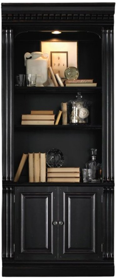 The top of the bookcase has a total of 3 exposed shelves including one adjustable wood-framed glass shelf, and there is a canister light controlled by a three-intensity touch switch. Two doors with one adjustable shelf behind. Crafted of cherry veneers. Telluride's black paint finish with reddish brown rub-through, carved leather panels and nail head trim give this collection a rich masculine look.