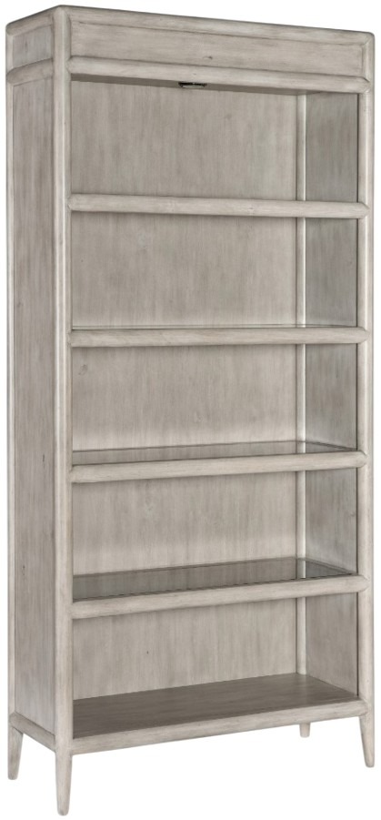 The Burnham bookcase is crafted of alder veneers with knots in a grey mink finish accentuated by a tactile veneer pattern on the back panel and slender tapered legs. Featuring 4-fixed wood-framed glass shelves, the bookcase has a puck light in the top with 3-intensity touch switch on the right pilaster.Read More