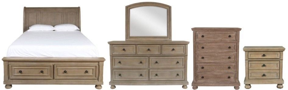 5 Piece Set include queen bed, dresser, mirror, nightstand and chest