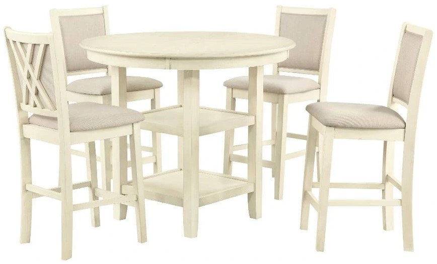 The Amy 5-piece counter dining set is meticulously crafted of solid rubberwood and mindi veneers creating a durable and visually appealing dining set. The farmhouse bisque finish, achieved through a multistep process, gracefully adorns both the chairs and table, highlighting the inherent beauty of the wood grain.Read More