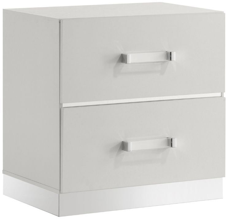 The Europa 2 drawer nightstand in white combines sleek, modern design with practical functionality. This nightstand features a gleaming white finish, mylar accents, and acrylic drawer pulls for a sophisticated look. Constructed with eco-friendly manufactured woods, it is built for durability, with surfaces finished in a glossy white topcoat.Read More