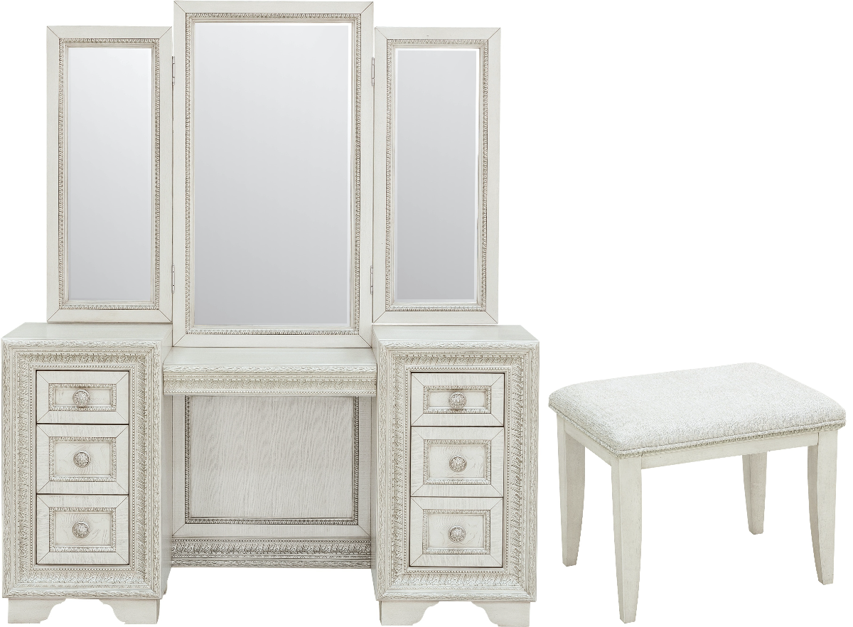 Camila adds a touch of glamour with this seven drawer vanity, stool with upholstered seat and the beautiful trifold mirror.Read More
