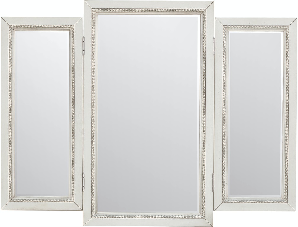The grand trifold Camila vanity mirror has romantic silver-tipped moldings seen throughout the bedroom collection. The trifold design is ideal for multi-angle viewing, and each mirror is beveled. The semi-transparent creamy white finish enhances the distinctive swirly ash veneer construction. Substantial wooden supports ensure that the mirror mounts securely to the vanity.Read More