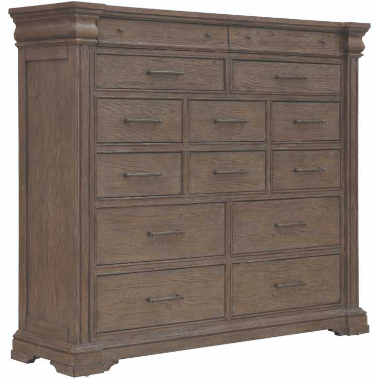 Our Madison Ridge brown collection boasts a larger scale that blends classic design elements with modern comfort. It features elegant pilasters on the bed and case pieces inspired by the architectural beauty of fireplace moldings. The natural bark finish on flat-cut oak brings out the rich grain and adds a layer of warmth and sophistication to every piece. Designed to make a bold yet inviting statement, this collection offers the convenience and versatility essential for today’s lifestyle.