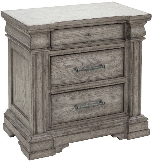 Keep your bedside must-haves at your fingertips when you add this sensational hearth-inspired nightstand to your bedroom. Featuring three drawers with smooth, quiet ball bearing side guides, it offers a beautiful side-pillar silhouette and antique silver drawer pulls that contrast with the soft grey finish.Read More