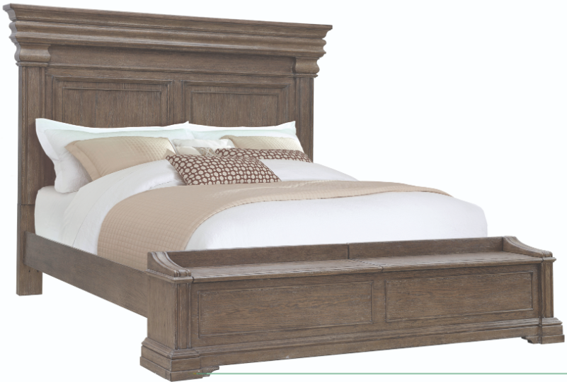 The Madison Ridge california king panel storage bed features warm brown finish with grey undertones, culminating in the mantle-like top edge of both the headboard and footboard. The footboard features dual-sided hinged top that opens away from the foot of the bed, revealing ample storage space.Read More