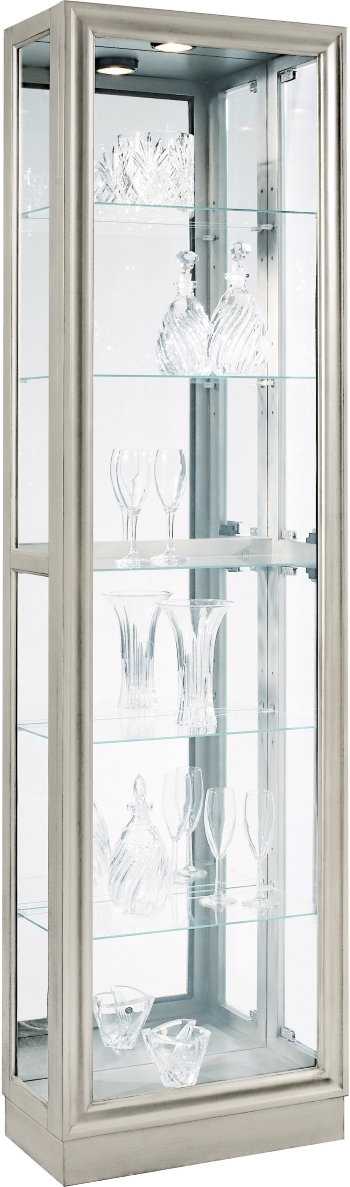 The beauty of this curio is in the simplicity of its form. The contemporary, linear styling blends beautifully with the Platinum finish. This curio features four adjustable glass shelves and one fixed shelf for plenty of display area. The mirrored back panel helps reflect the clean design.Read More