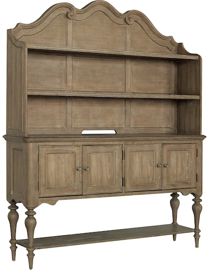 The Weston Hills flax seed sideboard and hutch is crafted with cathedral hickory veneers in a warm flax seed finish, this two-piece set showcases traditional charm through refined details like walnut inlays, scrollwork, and cane paneling—offering a timeless blend of beauty and function.Read More