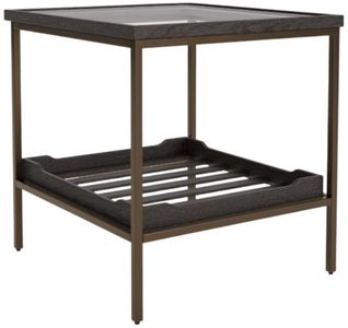 The Elkmont ravenwood black/brown end table is crafted from solid pine with a wire-brushed finish that reveals rich tan-brown tones beneath a sleek black overlay. A thick glass top adds elegance, while removable trays below provide versatile storage.Read More