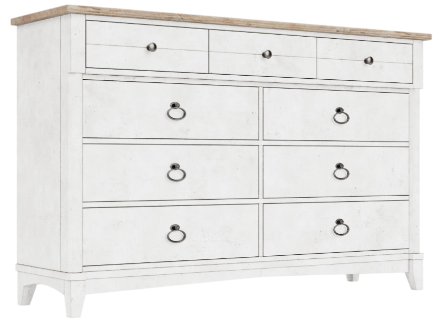 The Riverside Furniture Maddox Aged Cotton Dresser features a beautiful, weathered cotton finish that brings a rustic yet refined charm to your space. With ample storage, it combines style and functionality, offering spacious drawers for organization. The sturdy construction and timeless design make it a versatile addition to any bedroom.Read More