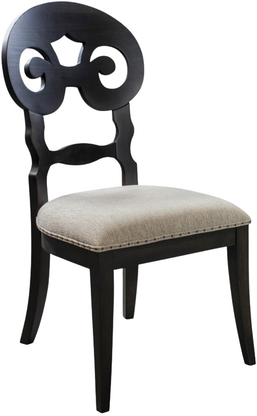 This Mix-N-Match Scroll Back Upholstered Dining Side Chair blends classic elegance with modern comfort. Featuring a gracefully scrolled back design, a rich rubbed black finish, and upholstered seat, it provides both style and support. Perfect for dining spaces, it complements a variety of decor styles.Read More