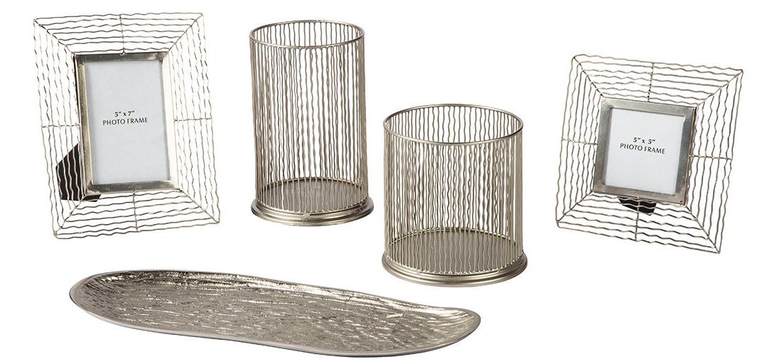 Make some waves with this highly contemporary accessory collection. Wonderfully open and airy, the wavy metal frames and hurricane candle holders beautifully go with the flow. Organic shaped tray is a natural complement.Read More