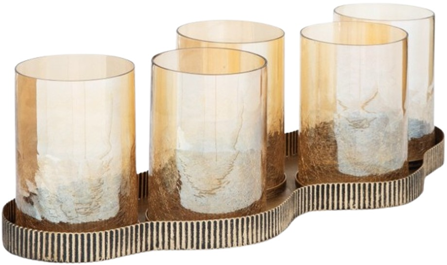 Create a cool-meets-cozy vibe with this candle holder. In an antiqued gold tone finish, the elegantly curved base offers a vintage feel sure to please. Pale amber glass votives cast a gentle glow when hosting your go-to pillar candles (sold separately).Read More