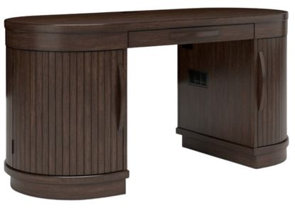 This home office desk is perfectly modern in every way. Finished on both sides in a rich wood tone, it can be floated in a room or used as a divider. Two half round door cabinets, each with an adjustable shelf, deliver a well-organized space for work-from-home professionals. It's a striking study in upscale contemporary form and function.Read More