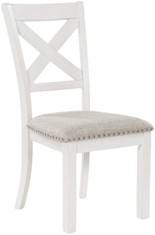 This dining chair is sure to impress come mealtime. With its antiqued white finish, classic country X-back and light gray upholstery with nailhead trim, modern farmhouse-style dining has never been so fashionable. All that's missing is you and your family.Read More