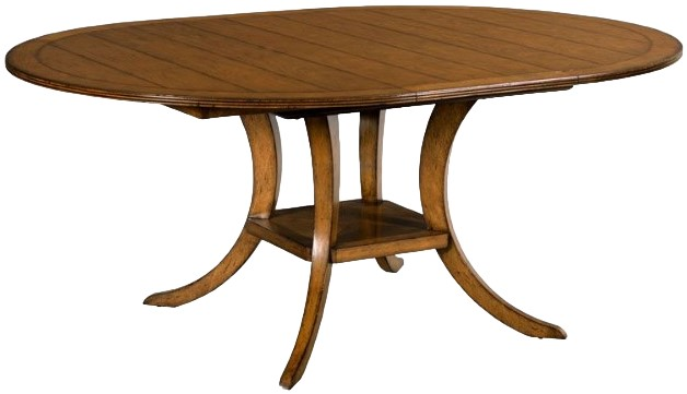 A wonderful table for dining with a round top that divides at its center to accommodate 2-18” fillers. The table is elevated on ample sable legs that are joined by a low square shelf.Read More