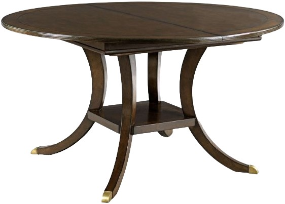 A wonderful table for dining with a round top that divides at its center to accommodate 2-18” fillers. The table is elevated on ample sable legs that are joined by a low square shelf.Read More