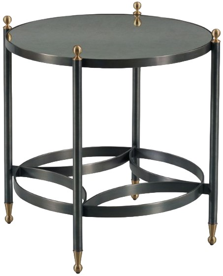 A lovely table adapted from mid 19th Century French garden furniture. Round metal posts crowned with brass finials support a round inset antiqued mirror top over a curvaceous and intricate metal stretcher.Read More