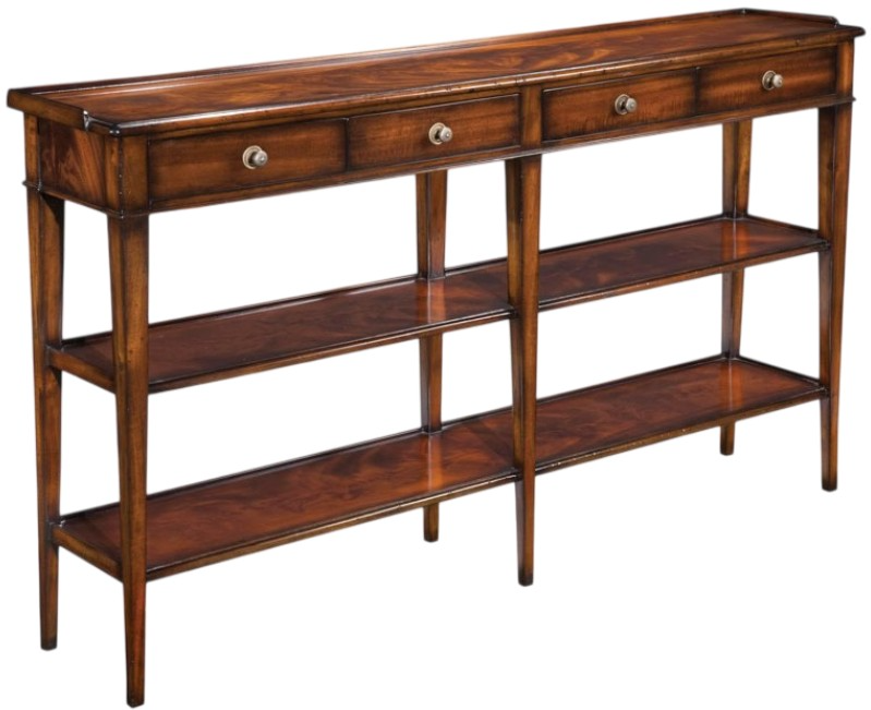 A rectangular galleried top is placed over four individual apron rail drawers elevated by six gracefully tapering posts. The posts are joined by two low galleried shelves. Make a bold statement by incorporating this stunning furniture into your home.Read More