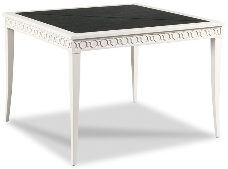 A framed square top inset with Pindler Buckaroo Black vinyl over apron rails that feature a pierced fretwork fitted with game-piece drawers on each side. The table is raised on squared posts that terminate to stylized cabriole feet.Read More