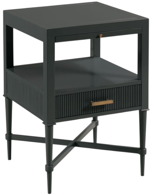 This petite bedside/lamp table features a pullout surface for drinks placed over an open area for books. The table has a reeded drawer elevated by squared tapering posts that are joined by an X stretcher.Read More