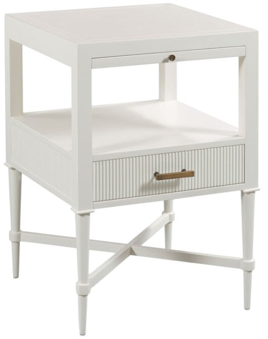 This petite bedside/lamp table features a pullout surface for drinks placed over an open area for books. The table has a reeded drawer elevated by squared tapering posts that are joined by an X stretcher.Read More